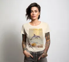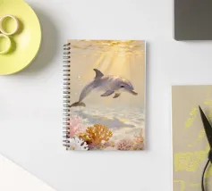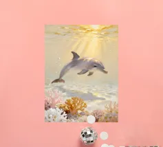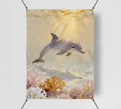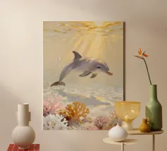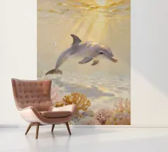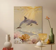 Badend in zachte gouden stralen drijft een dolfijn door kalm water omringd door pastelkleurig koraal. Dit stuk onthult de rustige ziel van de oceaan - vredig, elegant en gevuld met prachtige esthetiek. Bedacht door Trinkets NL Design Studio, gevisualiseerd met behulp van AI.