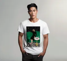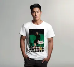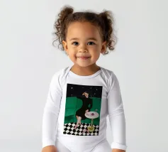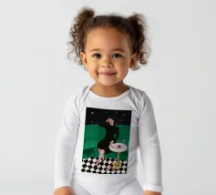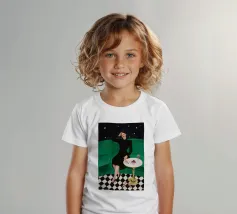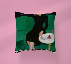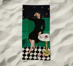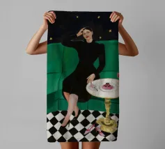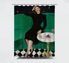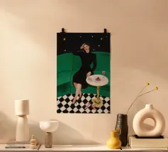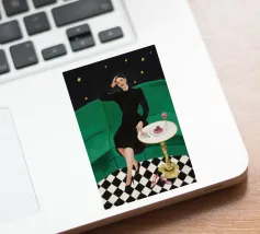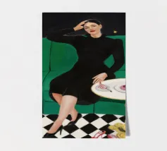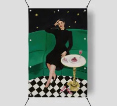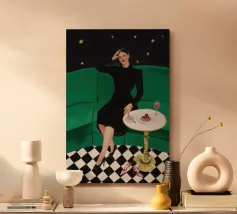 Een vrouw in een elegante zwarte jurk ontspant op een groene bank op een dambordvloer, met een nachtelijke sterrenhemel achter haar, waardoor een surrealistische en chique hemelse scène ontstaat.