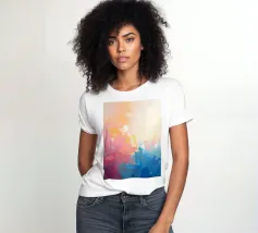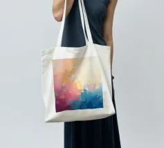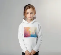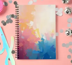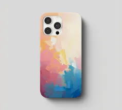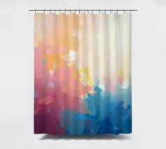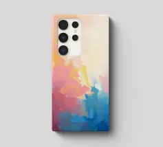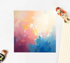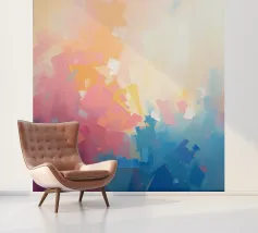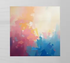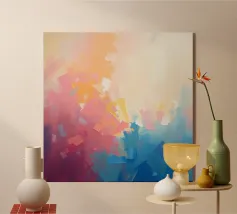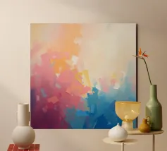 Levendige kleuren vermengen zich naadloos in dit abstracte werk en creëren een zacht verloop van warme naar koele tinten. Het kunstwerk toont een expressieve mix van vormen en kleuren.