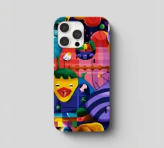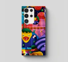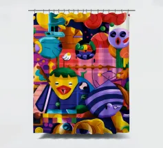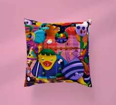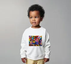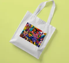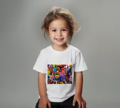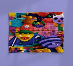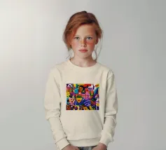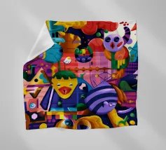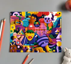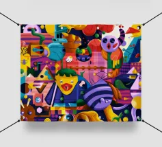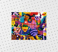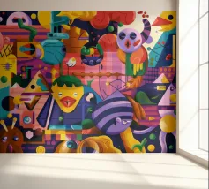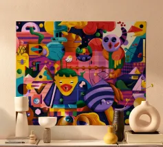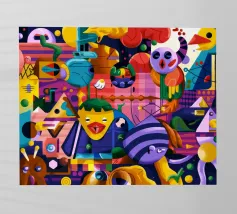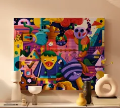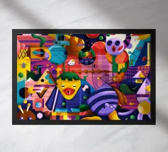 Een kleurrijke en abstracte compositie vol dynamische vormen en ingewikkelde patronen. Het gedurfde kleurgebruik en de expressieve streken creëren een levendige en energieke visuele ervaring.