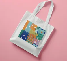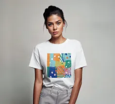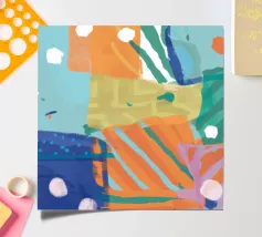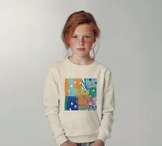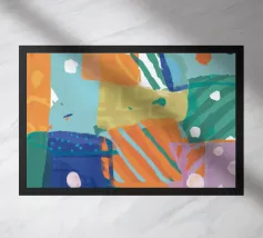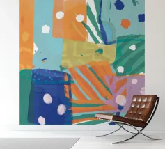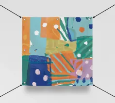 Een levendige abstracte collage lijkt op een lappendeken, met verschillende secties met verschillende texturen, patronen en kleuren, allemaal aan elkaar genaaid in een harmonieuze en speelse compositie.