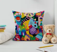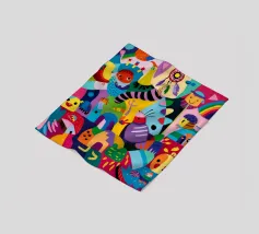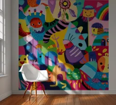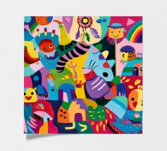 Een fascinerend mozaïek van abstracte vormen en oogverblindende tinten, dat lijkt op de verschuivende beelden van een caleidoscoop. De compositie straalt levendigheid en creativiteit uit.