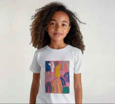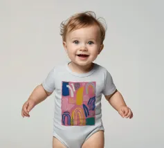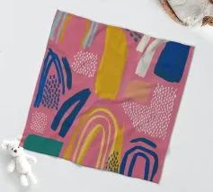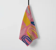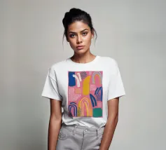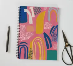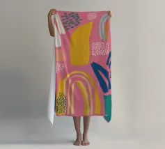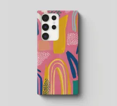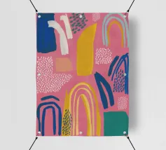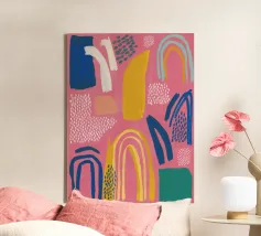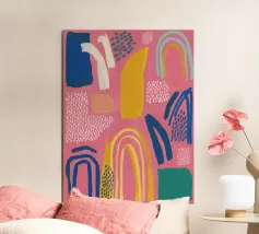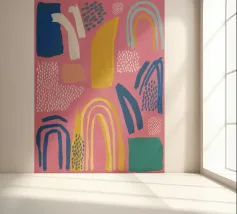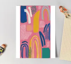 Een abstract kunstwerk vol beweging, met kleurrijke bogen, stippen en penseelstreken in een levendig palet van roze, paars en geel. Het is een vrolijk en energiek kunstwerk met een handgemaakt gevoel.