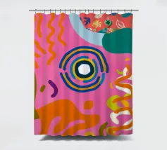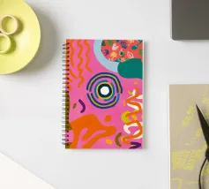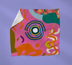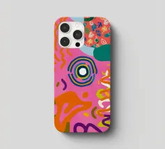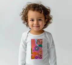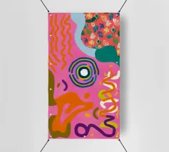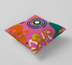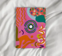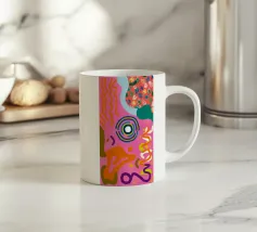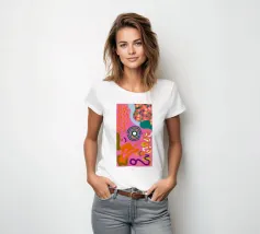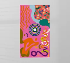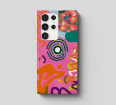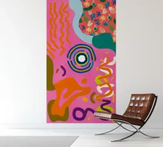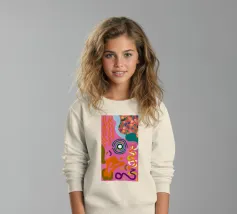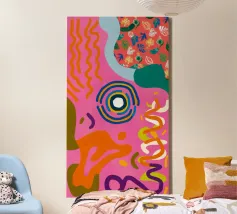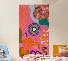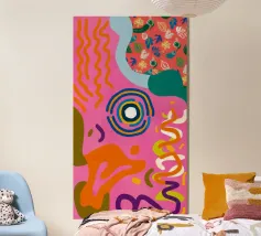 Een grillig abstract werk met speelse krabbels, organische vormen en ogen in een levendige, chaotische maar harmonieuze compositie die een symfonie van creatieve, kinderlijke energie suggereert.