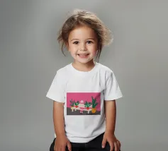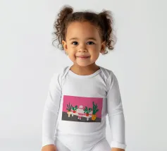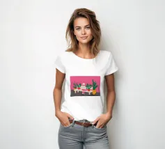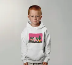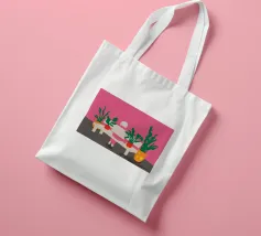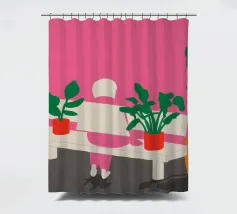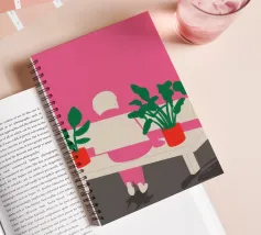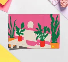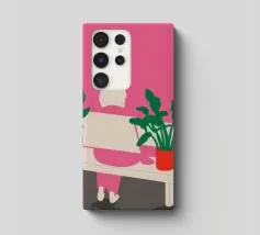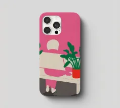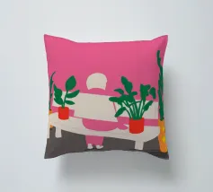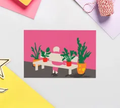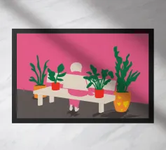 Twee figuren zitten samen op een bankje in een gezellige ruimte gevuld met een overvloed aan potplanten en cactussen tegen een felroze muur. De scène legt een vredig moment van verbondenheid vast in een persoonlijke stadstuin.