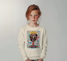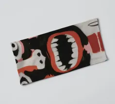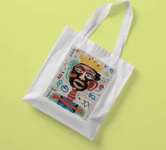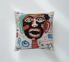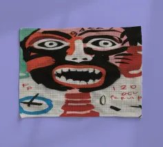 Verschillende symbolen en abstracte vormen zweven rond een centrale gestileerde figuur. De aanwezigheid van gekartelde lijnen en grillige kleuren versterkt het mysterie van de scène.