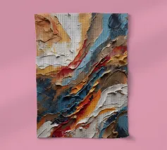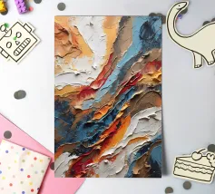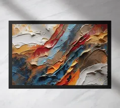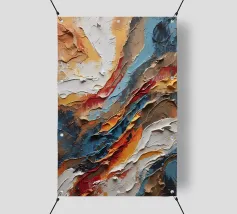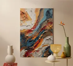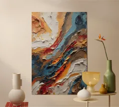 Een levendig abstract schilderij met textuur dat een gevoel van energie en beweging oproept. Felle streken oranje, blauw en rood creëren een dynamische compositie die zowel visueel opvallend als tot nadenken stemmend is.