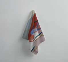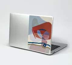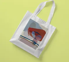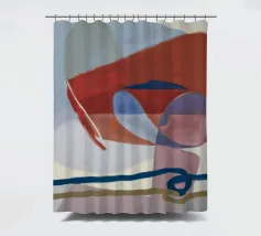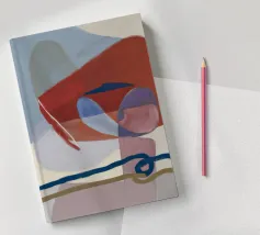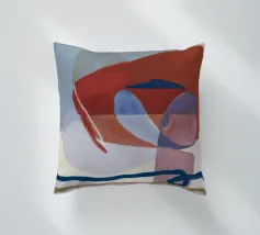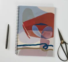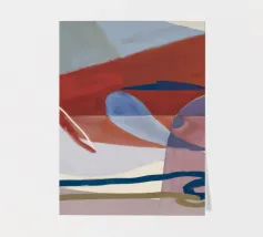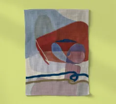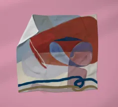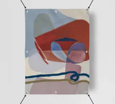 Een abstracte compositie met een dynamisch samenspel van vloeiende organische vormen in terracotta en beige met effen blauwe vormen, doorsneden door vloeiende lijnen die een gesprek tussen elementen suggereren.