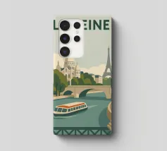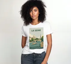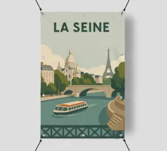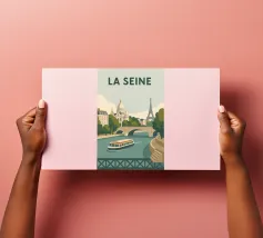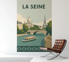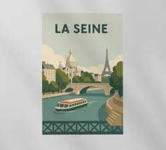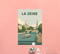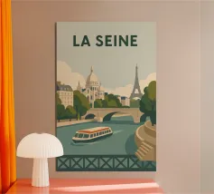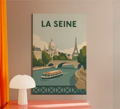 Vaar het hart van Parijs in met deze vintage poster die een iconische wandeling langs de Seine illustreert. De Eiffeltoren, Sacré-Coeur en Parijse bruggen komen samen in een poëtische compositie, die alle magie van de hoofdstad op de rivier vastlegt. Perfect voor een elegante, nostalgische inrichting, het belichaamt de essentie van Parijs.