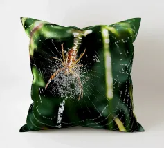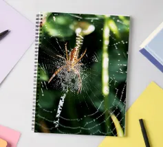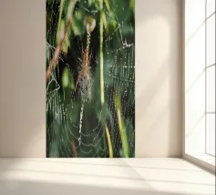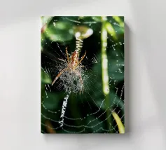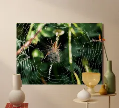 Een delicate spin rust in het midden van haar met dauw bedekte web in het zachte ochtendlicht. Elke streng glinstert van de kleine druppeltjes en vangt de stille schoonheid en ingewikkelde kunstzinnigheid van de natuur in een intieme close-up. Dit prachtige kunstwerk is perfect voor woonkamers, slaapkamers, kantoren, studiehoeken of elke andere ruimte waar ingewikkelde details en serene elegantie op prijs worden gesteld.