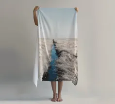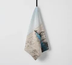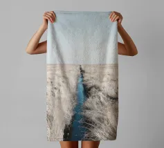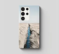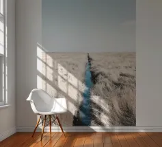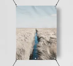 Dit motief van een eindeloos, natuurlijk graslandschap met een smalle waterloop geeft de rustgevende sfeer van uitgestrekte velden weer. De zachte beige en blauwe tinten geven een gevoel van vrijheid en sereniteit, perfect voor een minimalistische en op de natuur geïnspireerde decoratie. Ideaal voor muurschilderingen, kussens of mokken om een vleugje rust en ruimte aan je huis toe te voegen. Perfect voor liefhebbers van landschapsfotografie en modern Scandinavisch design.