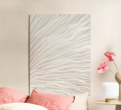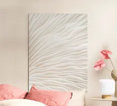 Dit kunstzinnige ontwerp heeft zachtjes vloeiende golven in een zacht, neutraal kleurenpalet dat doet denken aan natuurlijke texturen. De organische lijnen en delicate textuur geven het motief een kalm en harmonieus gevoel, ideaal voor moderne ruimtes die een gevoel van rust en ontspanning moeten uitstralen. Perfect voor muurschilderingen, kussens of mokken, dit motief brengt subtiele elegantie in elke omgeving en is een tijdloos middelpunt voor je huis.