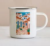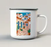Een prachtige illustratie van een zonovergoten Europees steegje met terracotta daken, charmante balkons en weelderige planten. Het warme licht en de pittoreske details creëren een perfecte vakantiedagdroom.