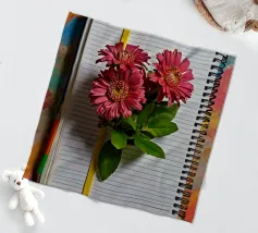 Een spiraalgebonden notitieboek met drie roze bloemen en groene bladeren op een kleurrijk houten oppervlak nodigt uit tot creativiteit en inspiratie.