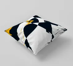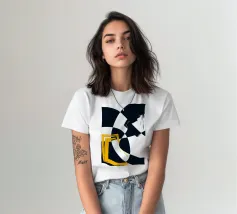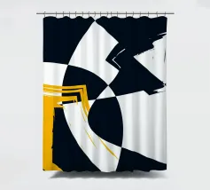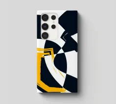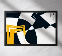 Abstracte vormen in zwart, wit en goud creëren een dynamische compositie met vloeiende rondingen en scherpe hoeken. Het samenspel van kleuren voegt diepte en beweging toe en suggereert een gevoel van energie en contrast.