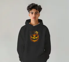 Twee ondeugende pompoenen met een dreigende grijns. De zin "Laten we een glimlach op dat gezicht toveren" staat in vette, speelse letters.