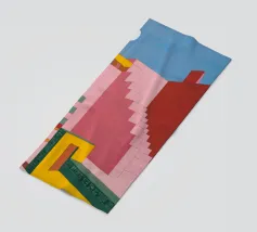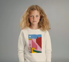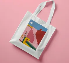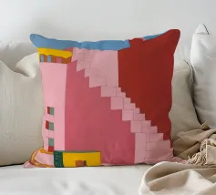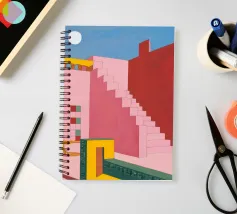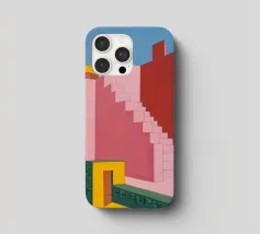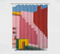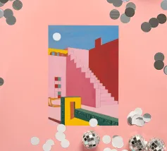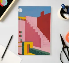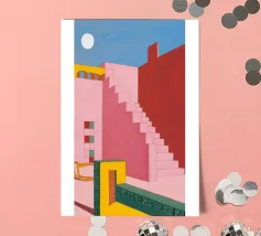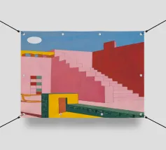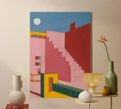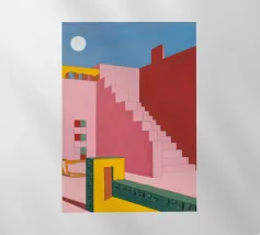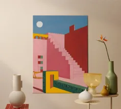Een dramatisch architecturaal werk met een lange roze trap die oploopt naar een felgele zon of maan tegen een donkerblauwe lucht. De compositie is gedurfd, minimalistisch en krachtig symbolisch.