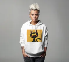 Een minimalistische zwart-wit illustratie van een slanke, zwarte kat met overdreven wijde ogen en schetsmatige trekken. Het grillige en abstracte ontwerp van de kat voegt een speels, artistiek tintje toe.