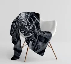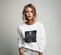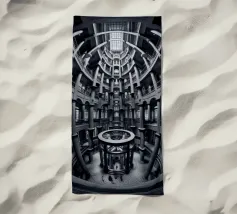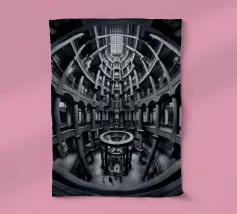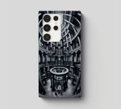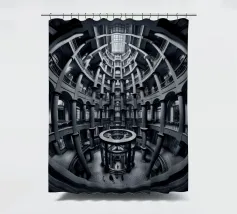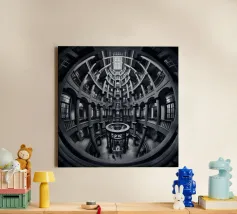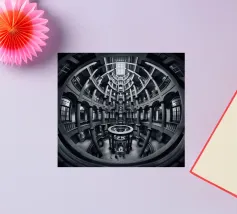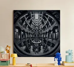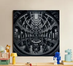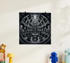 Een dramatisch, zwart-wit cirkelvormig interieur met torenhoge zuilen, gewelfde ramen en ingewikkelde geometrische patronen bekeken vanuit een fisheye-perspectief, dat de architectonische symmetrie en grandeur benadrukt.