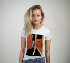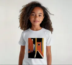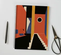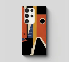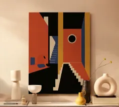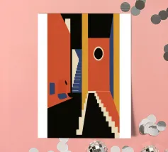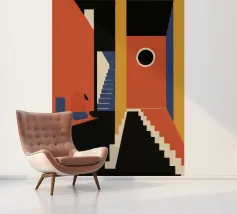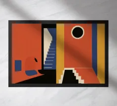 Een minimalistische, abstracte close-up van een architectonische vorm, met een grimmig witte trap tegen een oranje muur met een zwart cirkelvormig raam en diepe schaduwen.