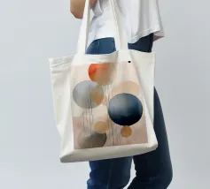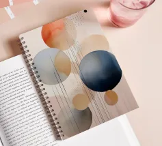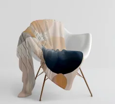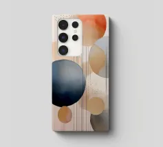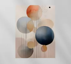 Een moderne abstracte compositie met overlappende cirkelvormen in zachte tinten beige, perzik en marineblauw. Delicaat lijnwerk en subtiele texturen creëren diepte en beweging, terwijl fijne gestippelde accenten een speels maar verfijnd accent toevoegen. Dit minimalistische ontwerp combineert elegantie met hedendaagse charme, waardoor het een veelzijdig stuk is voor moderne interieurs.