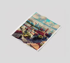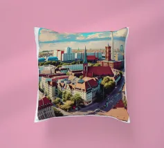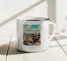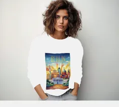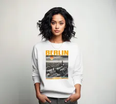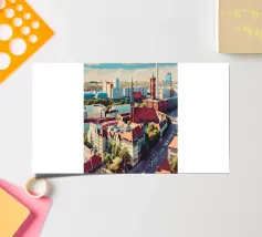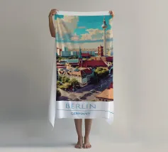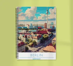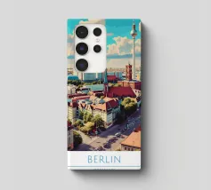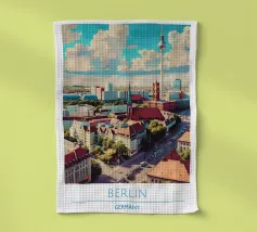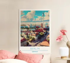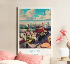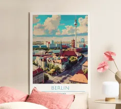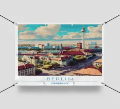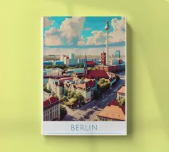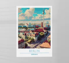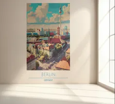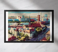 Bekijk de hoofdstad van Duitsland vanuit de lucht met deze dynamische digitale poster van Berlijn. Het kunstwerk toont een uitzicht over het stedelijke landschap, gemarkeerd door de iconische Fernsehturm (TV-toren) en de klassieke rode bakstenen architectuur van het stadscentrum. Een drukke straat en een mix van historische en moderne gebouwen zijn zichtbaar onder een heldere hemel met dramatische wolken. Dit hoogwaardige digitale bestand (7000x5000 pixels, 300 dpi) biedt een uitstekende helderheid en verzadigde kleuren, perfect voor verzamelaars van stedelijke kunst en liefhebbers van Europese reizen.