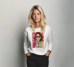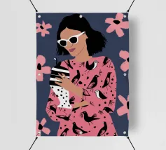 Een portret van een chique vrouw met zonnebril en roze gevlekte blouse, kijkend naar haar smartphone. De illustratie legt een openhartig, stijlvol moment van het moderne leven en digitale verbinding vast.