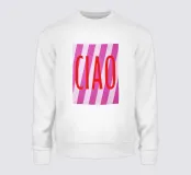 De tekstposter met het Italiaanse woord "Ciao" in grote rode blokletters straalt levensvreugde uit. Omringd door roze en wit-roze horizontale strepen brengt het een vrolijke stemming over. Deze typografische illustratie is het perfecte zomermotief voor groeten en afscheid.