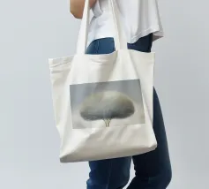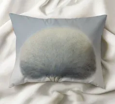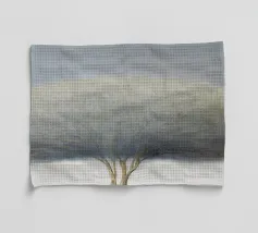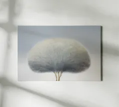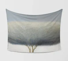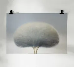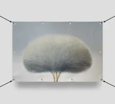 De afbeelding toont een delicate, abstracte boom met een zachte, koepelvormige kroon in zachte grijs- en blauwtinten. Fijne stippen en lijnen in warm goud geven het motief een elegant, bijna glinsterend effect. Het rustige kleurenpalet creëert een vredige, poëtische sfeer.