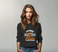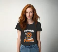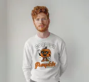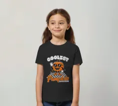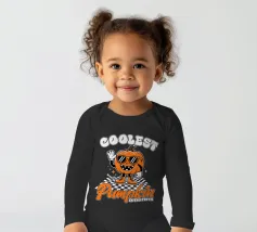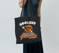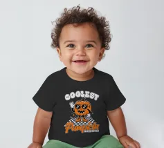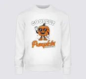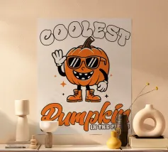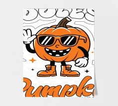 Een vrolijk pompoenpersonage met zonnebril en laarzen zwaait, met vetgedrukte tekst die hem uitroept tot de "Coolste Pompoen in de Patch".