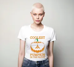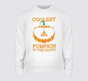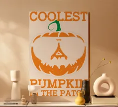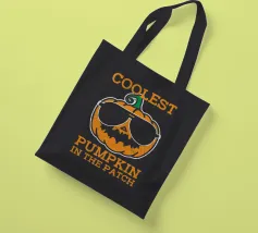 In het midden staat een cartoonpompoen met een zonnebril op. De tekst boven en onder de pompoen luidt "Coolest Pumpkin in the Patch.