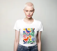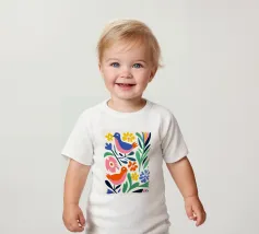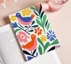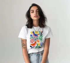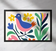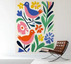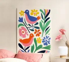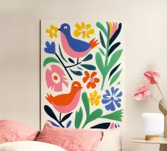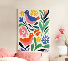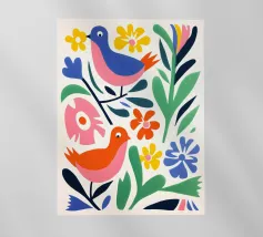 Dit betoverende ontwerp met kleurrijke vogels en bloemenelementen in blauw, roze, oranje en geel brengt een vrolijke lichtheid in elke kamer. De harmonieuze combinatie van natuurmotieven en felle kleuren maakt het een echte blikvanger. Perfect voor mokken, kussens, muurschilderingen of T-shirts - een prachtige keuze voor iedereen die een vleugje natuur en creativiteit wil toevoegen aan zijn dagelijks leven.