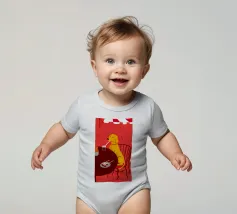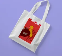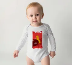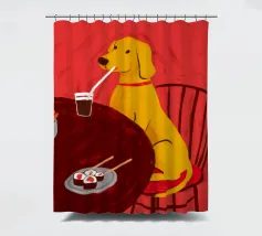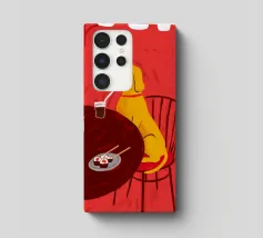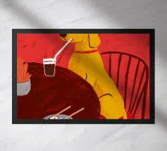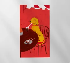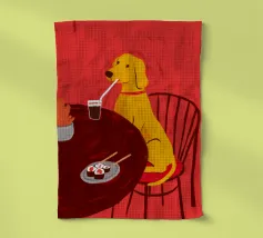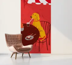 Een grillige illustratie van een gele dinosaurusachtige figuur aan een tafel, nippend van een drankje met een rietje, tegen een opvallende rode achtergrond.