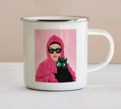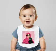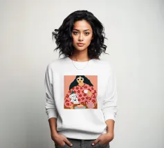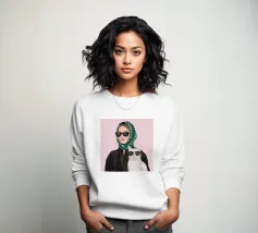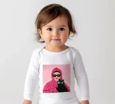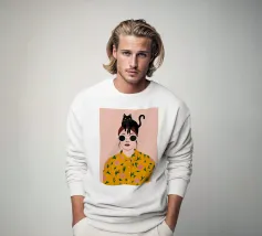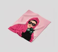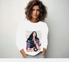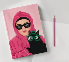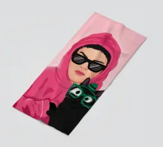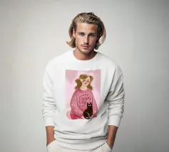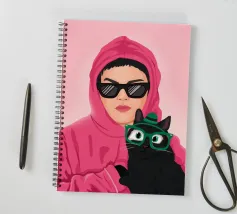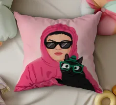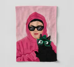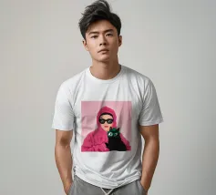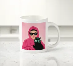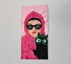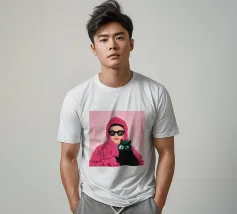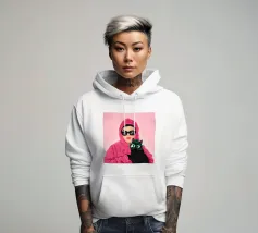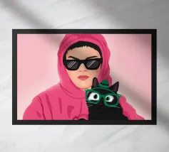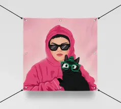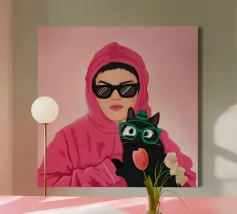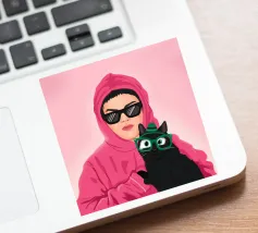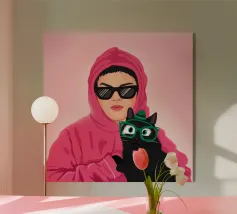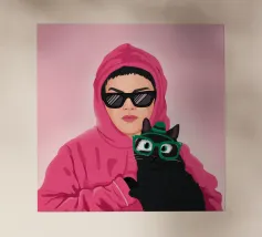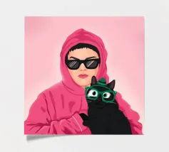 Een chique en mysterieus portret van een vrouw in een felroze hoodie en donkere zonnebril, die een slanke zwarte kat vasthoudt. De felle kleuren en koele, raadselachtige uitdrukking creëren een modern en stijlvol statement.