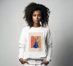 Dit vrolijke bloemmotief toont een gestileerde blauwe vaas gevuld met kleurrijke bloemen in oranje, rood, geel en roze, omlijst door een warme koraaltint. Het ontwerp straalt levensvreugde en harmonie uit en is perfect voor muurschilderingen, kussens, mokken, hoesjes voor mobiele telefoons en meer. Ideaal voor iedereen die houdt van een frisse, moderne esthetiek en zijn huis wil opfleuren met kleurrijke, natuurlijke accenten. Dit tijdloze bloemstuk past in elke kamer en elke woonstijl.