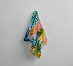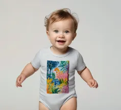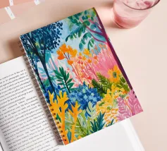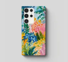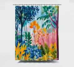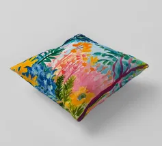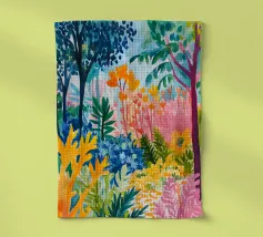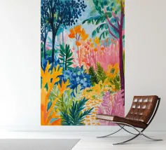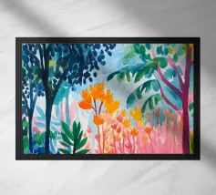 Een levendig en kleurrijk boslandschap met weelderig gebladerte in blauwe, oranje, roze en groene tinten. Verschillende planten en bomen creëren een levendige, dynamische compositie met heldere, contrasterende kleuren. Het gebruik van felle kleuren geeft de scène een energieke en grillige sfeer.