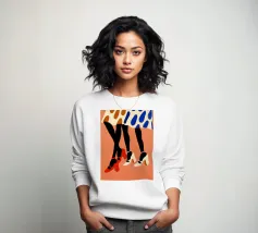 Een illustratie van een paar benen in een dynamische pose, versierd met funky, mismatched gestreepte kousen in felle kleuren. Een speelse en energieke viering van expressieve, non-conformistische stijl.