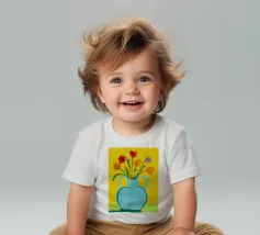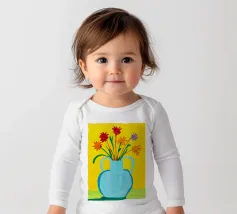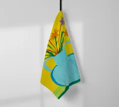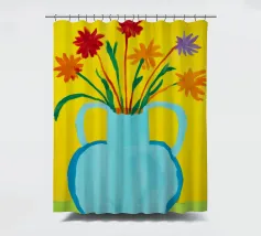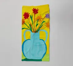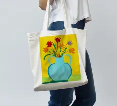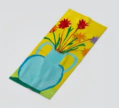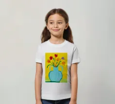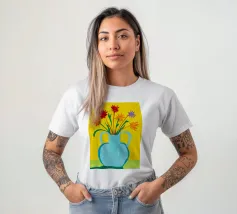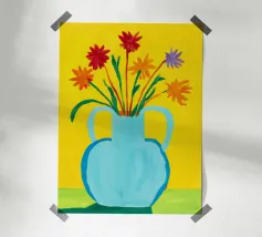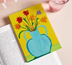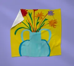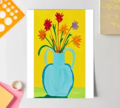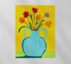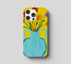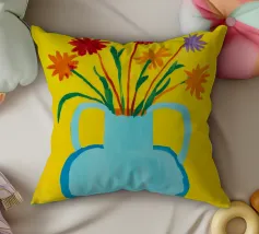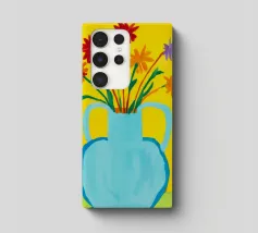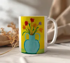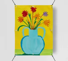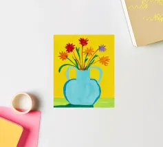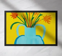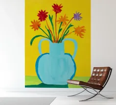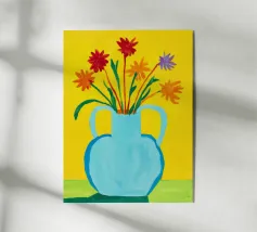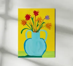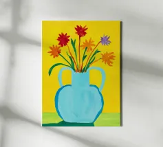 Een vrolijk, expressief boeket gele bloemen in een helderblauwe vaas met twee grote hengsels. De zonnige gele achtergrond versterkt het gevoel van pure, eenvoudige en onvervalste vreugde.
