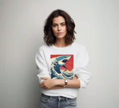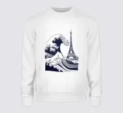 De afbeelding toont een gestileerde, zwart-wit illustratie van de Grote Golf bij Kanagawa, een beroemde Japanse houtsnede, met de Eiffeltoren bovenop de golf. De golf is afgebeeld in een dynamische, wervelende beweging, met schuimkoppen en een diepblauwe basis. De Eiffeltoren is hoog en slank en de ingewikkelde structuur contrasteert met de organische vorm van de golf.