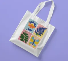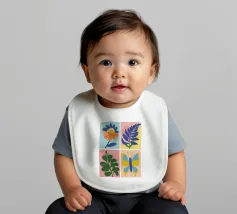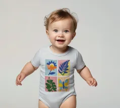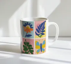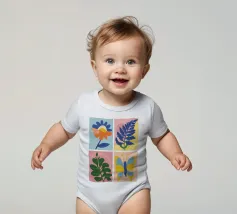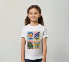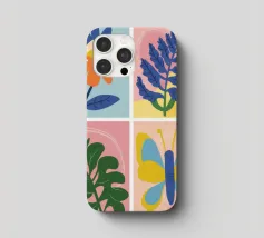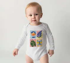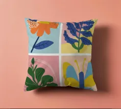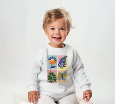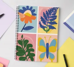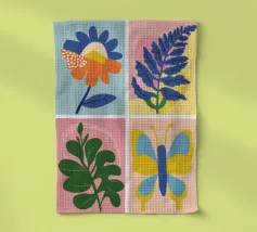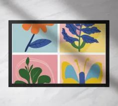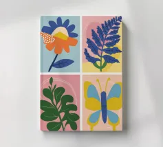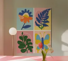 Een charmant raster van vier illustraties toont een bloem, een varen, bladeren en een vlinder, waardoor een mooie en educatieve botanische studie ontstaat.