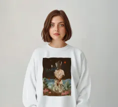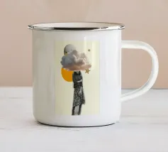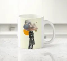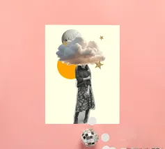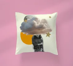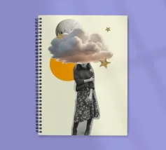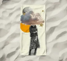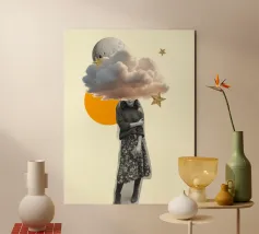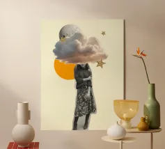 Dit surrealistische collagekunstwerk toont een vrouw in vintage-stijl wiens hoofd is vervangen door een zachte, pluizige wolk, omringd door glinsterende sterren en een gloeiende maan op de achtergrond. Het gedempte kleurenpalet, gecombineerd met gedurfde accenten zoals de oranje zonnevorm, creëert een grillige, dromerige sfeer. Perfect voor fans van retro surrealisme, hemelse kunst en introspectieve wanddecoratie met een poëtisch tintje.