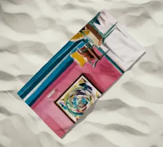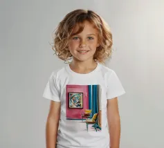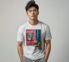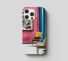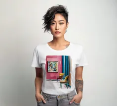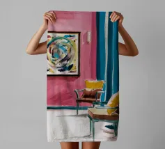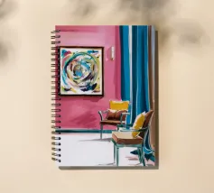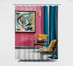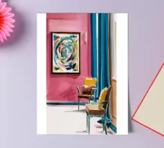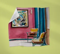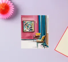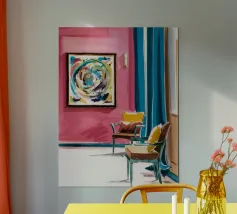 Een levendig, abstract interieur met een groot, wervelend, kleurrijk kunstwerk aan de muur. De kamer heeft een mix van moderne meubels en felle kleuren, waardoor een dynamische, artistieke en zeer expressieve leefruimte is ontstaan.