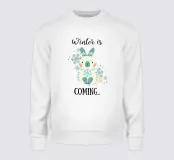Een schattig winterkonijntje met zachte oren omringd door zachtjes drijvende sneeuwvlokken. Het konijntje is klaar voor het koude seizoen. Boven hem staat de inscriptie "Winter is Coming" in een elegant en speels lettertype om het ontwerp af te maken.