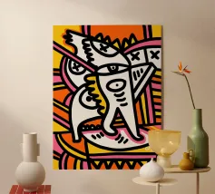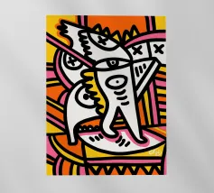 Met The Colorwatcher versmelt Emmanuel Signorino graffiti-esthetiek en geometrische abstractie tot een levendig pop-surreëel tafereel. De krachtige zwarte lijnen, dynamische vormen en het levendige palet van oranje, geel en roze creëren een werk dat levendig aanvoelt met stedelijk ritme en artistieke precisie.