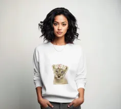 Portret van een leeuw met grote, expressieve ogen en een zwart-witte bloemenkrans. De zachte vacht wordt perfect benadrukt in een minimalistische fotografische illustratie en vangt de buitengewone charme van de natuur. Ideaal voor dierenliefhebbers.