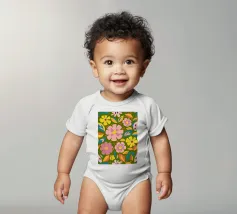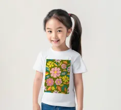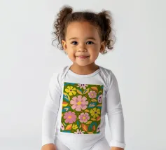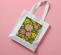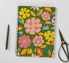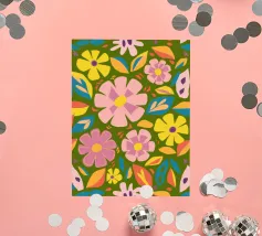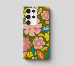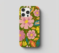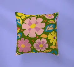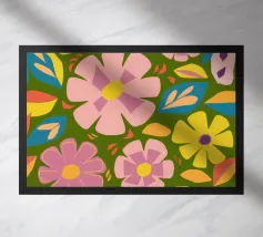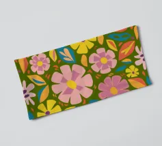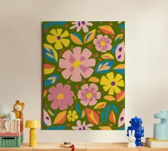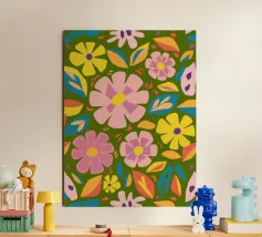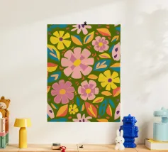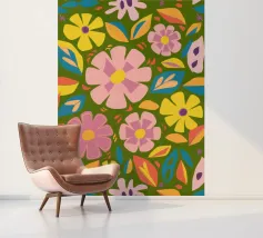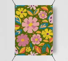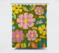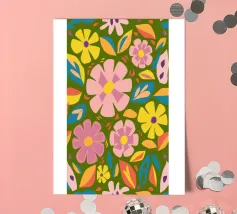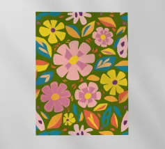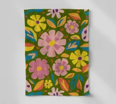 Een mooi, zacht patroon van roze en gele bloemen ligt verspreid over een rijke, donkergroene achtergrond. De stijl is zacht en schilderachtig, waardoor het bloemenontwerp een warme, licht vintage uitstraling heeft die zowel mooi als troostend is.