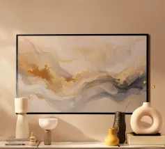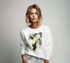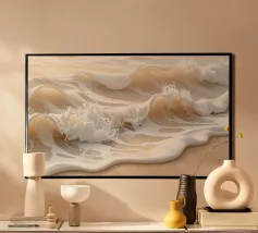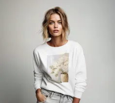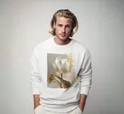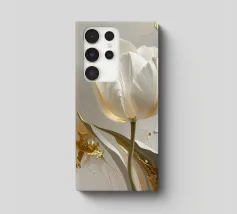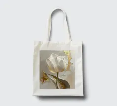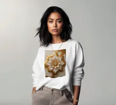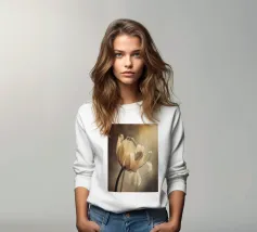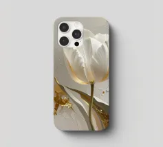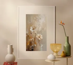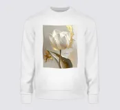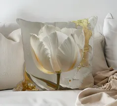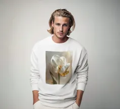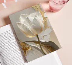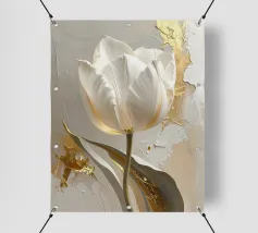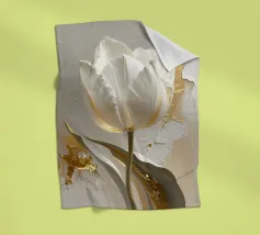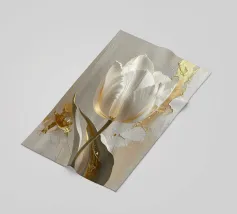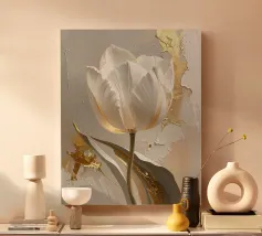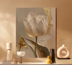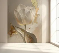 Deze delicate bloesem ontvouwt zich als een stil moment vol gratie. De zachte, gebogen vormen lijken bijna gewichtloos, alsof de bloem in stilte zweeft. De edele witte kleur, gecombineerd met warme gouden accenten, straalt een kalme elegantie uit die meteen ontroert. De gestructureerde achtergrond creëert subtiele contrasten en laat het bloemmotief eruit springen als een kostbaar kunstobject. Elke lijn lijkt harmonieus, elke kromming spreekt van rust, helderheid en een vleugje luxe. Dit ontwerp brengt een zachte, tijdloze schoonheid in de kamer.