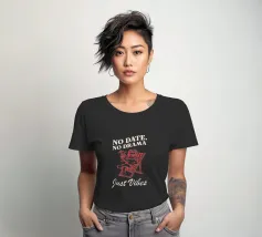 Een ontspannende scène toont cherubijnen op een ligstoel die genieten van een drankje, vergezeld van de zin "No Date, No Drama, Just Vibes". De afbeelding straalt een relaxte en stressvrije sfeer uit.