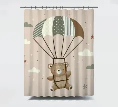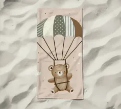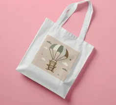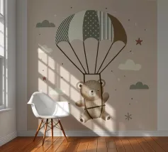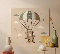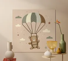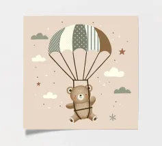 Dit leuke motief toont een vrolijke beer die zachtjes door de lucht zweeft met een kleurrijke parachute. De zachte beige en pastelkleuren in combinatie met delicate patronen en minimalistische wolken geven deze illustratie een tijdloze charme. Een perfect ontwerp voor liefhebbers van schattige dierenmotieven en dromerige scenario's.Schattig motief met een zwevende beer Zachte kleuren en mooie details Minimalistisch ontwerp met pastelkleuren. Stijl geïnspireerd door dieren- en natuurillustraties Ideaal voor dierenliefhebbers en liefhebbers van speels