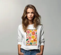 Een prachtig patch van grillige, gestileerde wilde bloemen is geïllustreerd in een charmante, volkskunst geïnspireerde stijl, met een heerlijke mix van kleuren en vormen die vreugde en natuurlijke schoonheid uitstralen.